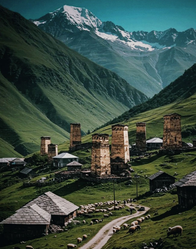 Georgia, at the crossroads of Europe and Asia, inspires artists with its rich culture and creative legacy, from the folk art of Nikо Pirosmani to the cinematic vision of Sergei Parajanov, alongside traditional supra feasts, ancient monasteries, Svan towers, and the vibrant streets of Tbilisi, set against stunning mountains and vineyards.